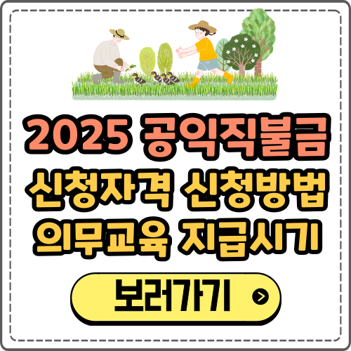 아래에서 공익직불금의 신청 자격, 신청 기간 및 방법, 의무교육, 지급 시기 등에 대해 자세히 알아보실 수 있습니다.